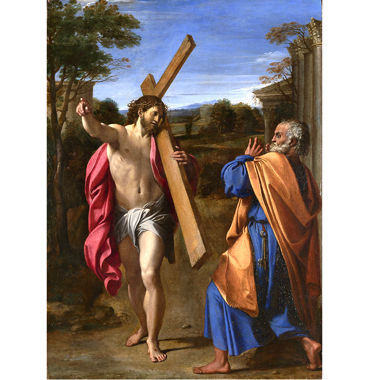 Das Bild stellt die Legende über eine Episode aus der Christenverfolgung im Jahr 67 oder 68 n. Chr. dar. Petrus verließ auf der Via Appia die Stadt Rom und unterwegs begegnete ihm Christus. Der Apostel fragte ihn: „Herr, wohin gehst du?“. Als er die Antwort gehört hatte, er komme, um sich noch einmal kreuzigen zu lassen, brach Petrus beschämt seine Flucht ab und kehrte um. In Rom wurde er dann verhaftet und gekreuzigt.