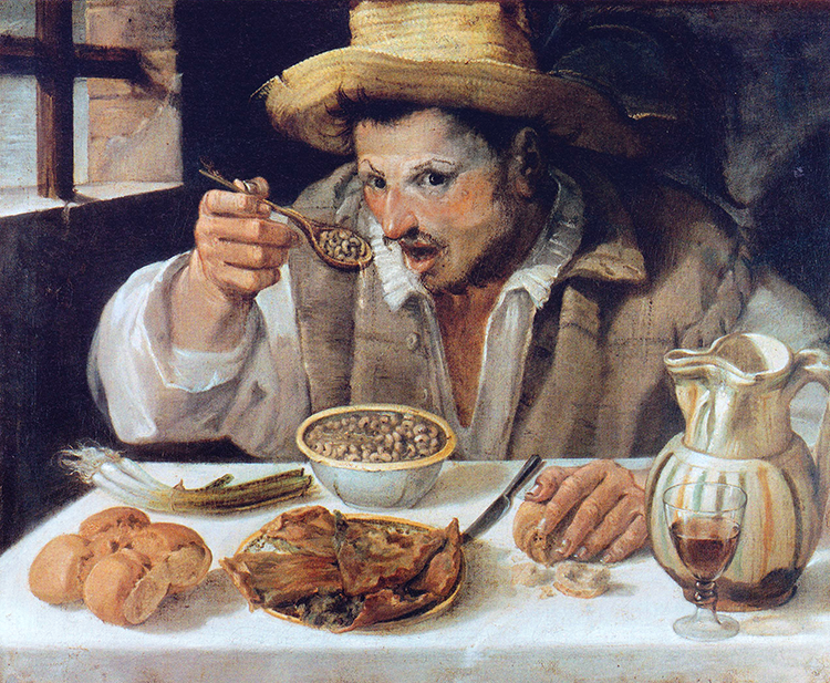 In Annibale Carraccis berühmtem Gemälde „Der Bohnenesser“ gewährt uns der Künstler einen Blick in ein schlichtes Zimmer, wo ein Mann in Hemd, Weste und Strohhut an einem Tisch sitzt. Er nimmt gerade mit einem Löffel Bohnen und einer Hand nach einem Stück Brot, das neben ihm liegt. Carracci fängt geschickt den Moment der Handlung ein, wodurch das Bild wie ein lebendiger Moment wirkt und uns fasziniert.