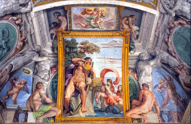 Das Programm mythologischer und allegorischer Szenen für das Camerino (ein kleines privates Arbeitszimmer) und die Ovid-Galerie wurde vom Humanisten Fulvio Orsini vorbereitet, der als Hofbibliothekar des Kardinals fungierte. Das Gewölbe der Galerie enthält Episoden, die hauptsächlich aus Ovids Metamorphosen stammen. Einzelne Szenen, platziert in einem schmalen Raum von 20 x 6 m mit halbrundem Tonnengewölbe, wurden in eine illusionistisch behandelte Architekturstruktur eingefügt, ergänzt durch antike Ornamente und Medaillons (quadri riportati). Das Hauptgemälde an der Decke zeigt beide Gottheiten, Bacchus und Ariadne, auf von Leoparden und Ziegen gezogenen Streitwagen. Vor ihnen reitet ein betrunkener Sylen auf einem Esel, unterstützt von nackten jungen Männern, die tanzen und verschiedene Instrumente spielen.