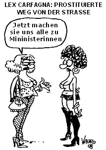 Mit dem Gesetzesvorschlag von Gleichstellungsministerin Mara Carfagna sollte (September 2008) auch die Straßenprostitution verboten werden. Damit sollte der Prostitution, die zu Frauenhandel und "Sklaverei" führe, ein „schwerer Schlag" versetzt werden, so die Ministerin der Regierung Berlusconi. Erstmals sollten durch dieses Gesetz in Italien auch die Kunden von Straßenprostituierten bestraft werden, nicht aber die Kunden von Prostituierten, die in Wohnungen arbeiten. Pikanterweise ist die Ministerin selbst als Ex-Nacktmodell und -Show-Girl in den Berlusconi-Sendern bekannt!